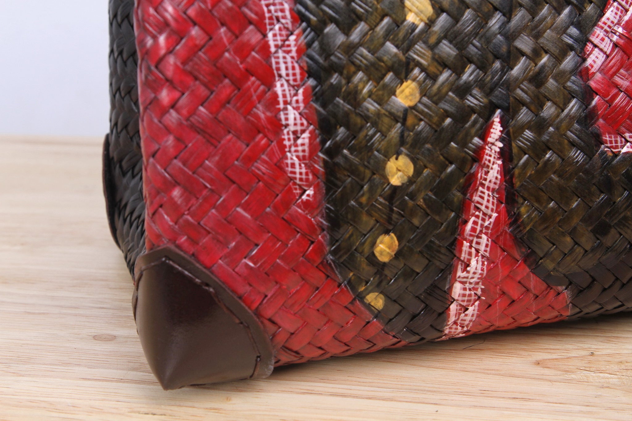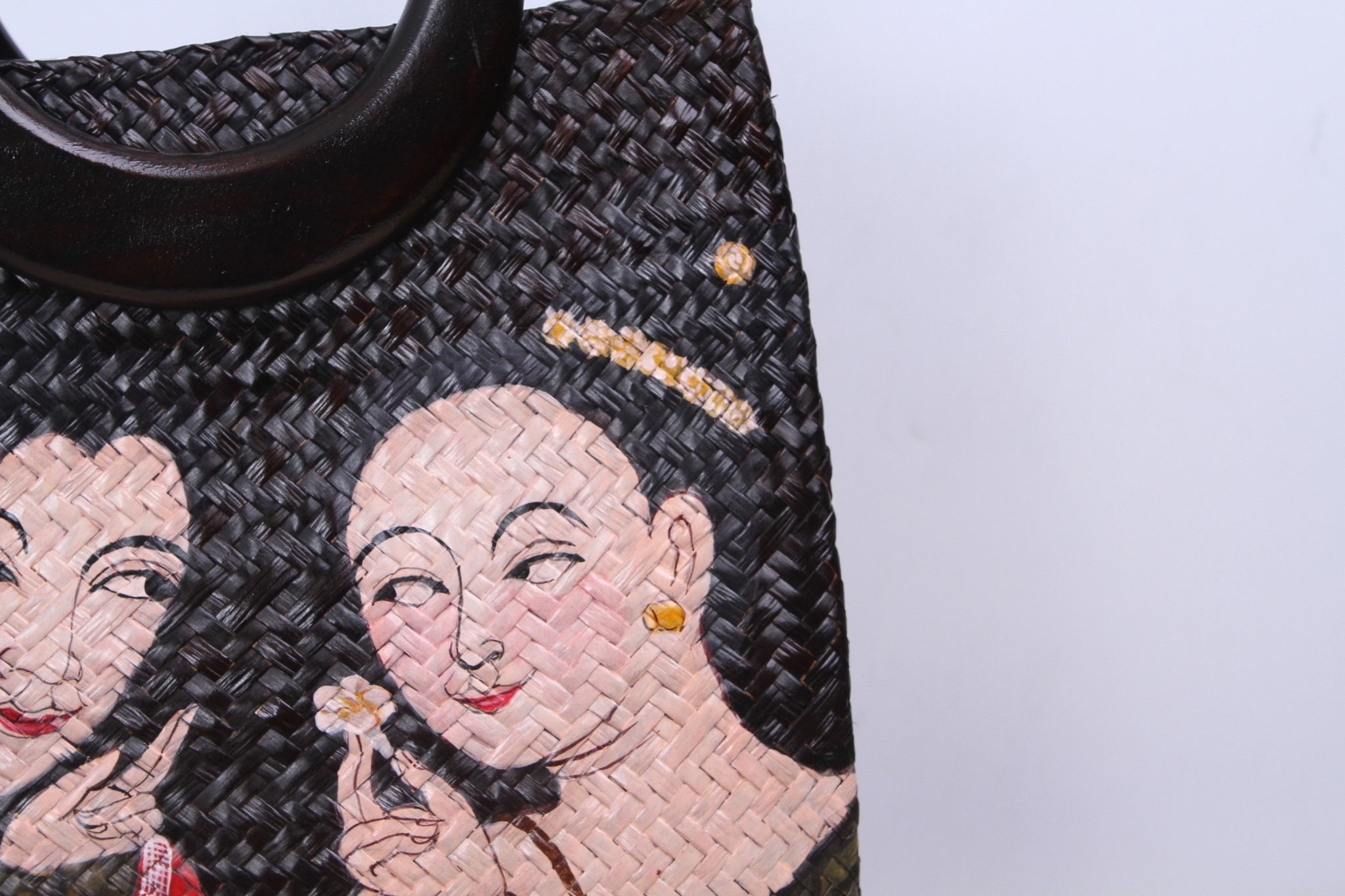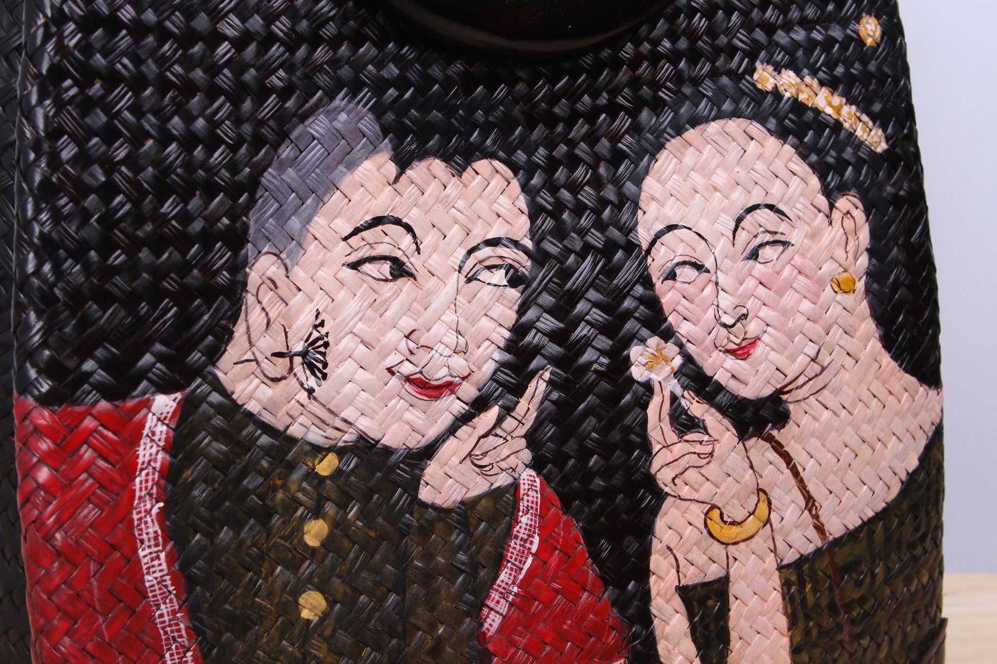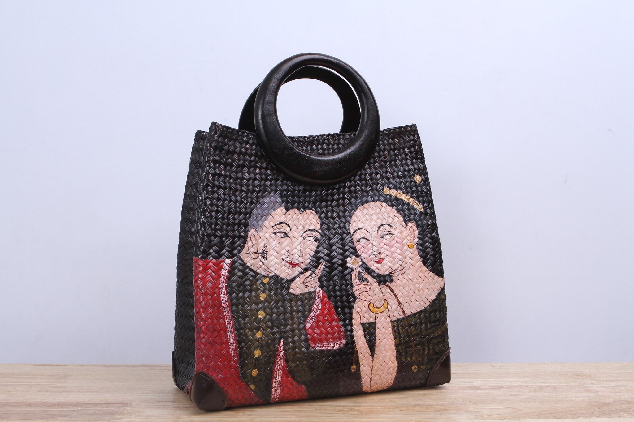 - In collaboration of Thai designers and artisan perfectly creates a woven dyed sedge incorporated with a wooden handle. Exquisite design and quality for modern consumers decorated using Thai contemporary art style painting.
