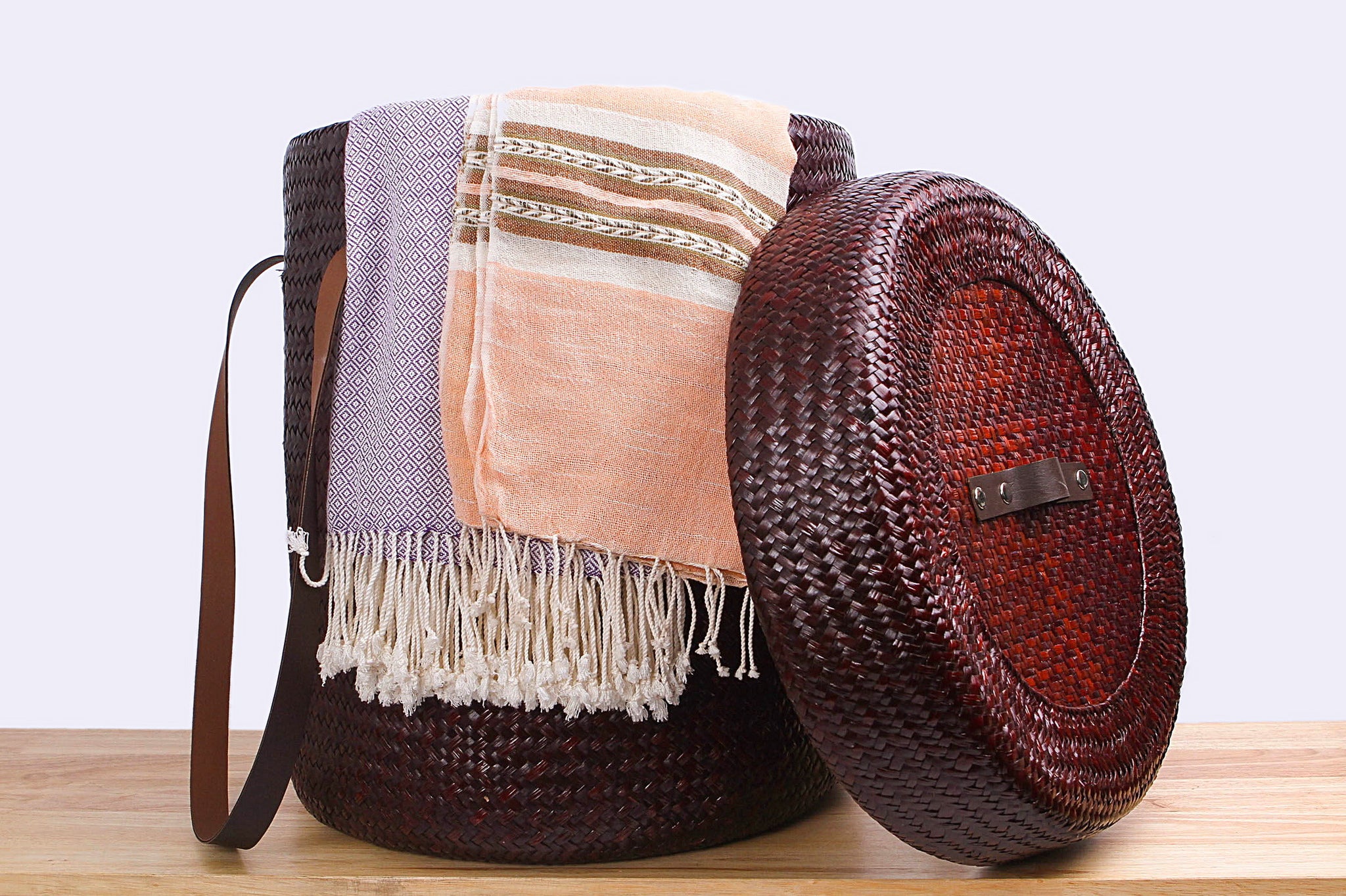 - A wicker basket used for storage or laundry.